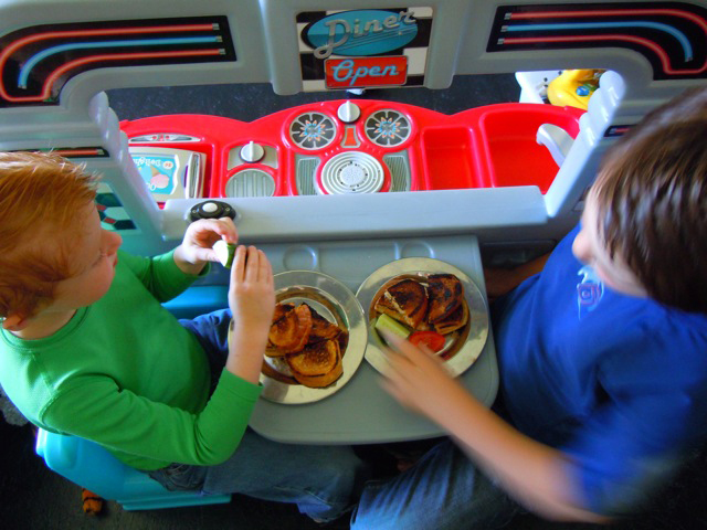 After making a standard grilled cheese sandwiches and sliced veggies for lunch for them, the boys decided to sit in their diner kitchen, a gift years ago from their grandparents.